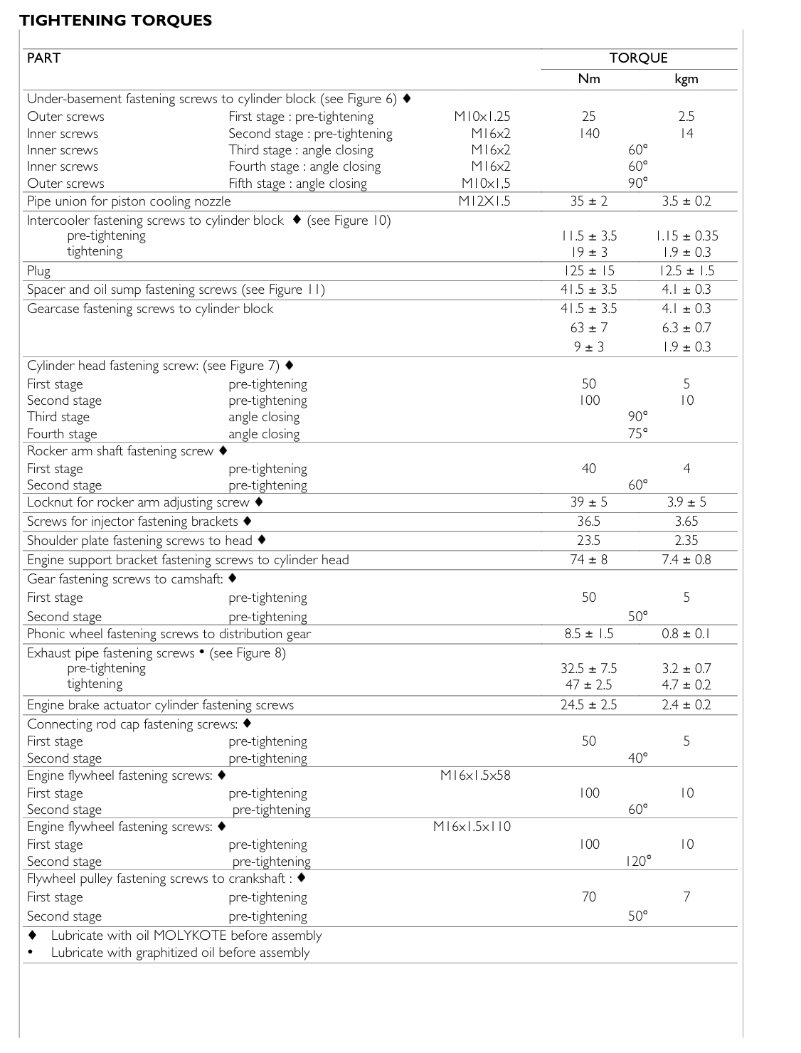 - Torque settings, Lubricant and liquid guides and Tool requirements for each job